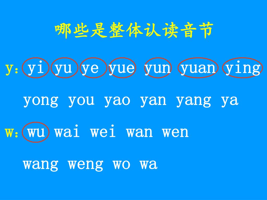 哪些是整体认读音节 y:yi yu ye yue yun yuan ying yong you yao yan yang ya w:wu wai wei wan wen wang weng wo wa