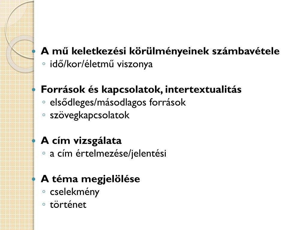 A mű keletkezési körülményeinek számbavétele • idő/kor/életmű viszonya • Források és kapcsolatok, intertextualitás • elsődleges/másodlagos források • szövegkapcsolatok • A cím vizsgálata • a cím értelmezése/jelentési • A téma megjelölése • cselekmény • történet