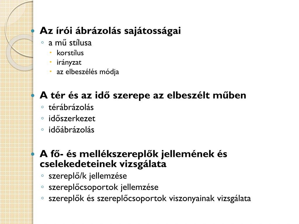 Az írói ábrázolás sajátosságai • a mű stílusa • korstílus • irányzat • az elbeszélés módja • A tér és az idő szerepe az elbeszélt műben • térábrázolás • időszerkezet • időábrázolás • A fő- és mellékszereplők jellemének és cselekedeteinek vizsgálata • szereplő/k jellemzése • szereplőcsoportok jellemzése • szereplők és szereplőcsoportok viszonyainak vizsgálata
