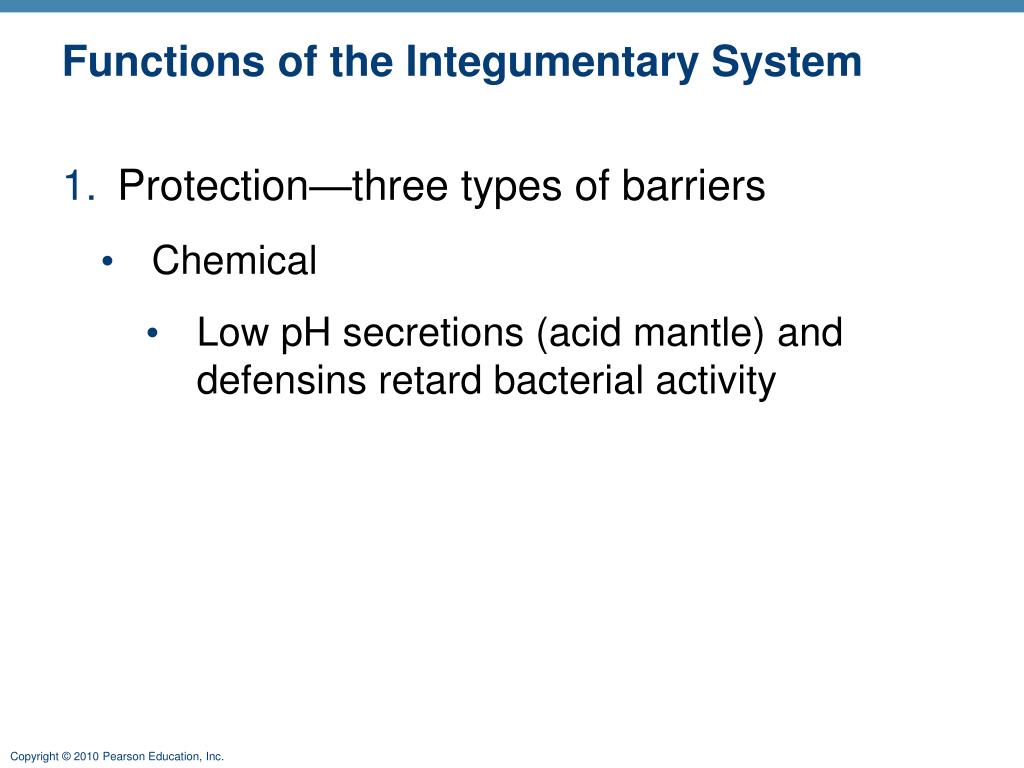 Functions of the Integumentary System • Protection—three types of barriers • Chemical • Low pH secretions (acid mantle) and defensins retard bacterial activity