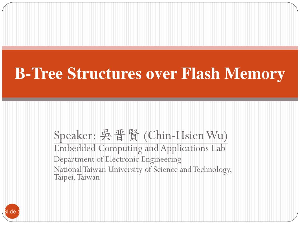 B-Tree Structures over Flash Memory Speaker: 吳晋賢(Chin-Hsien Wu) Embedded Computing and Applications Lab Department of Electronic Engineering National Taiwan University of Science and Technology, Taipei, Taiwan