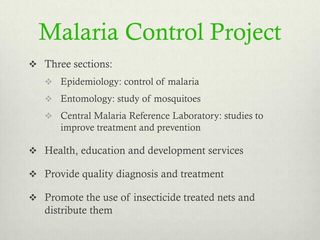 Malaria Control Project • Three sections: • Epidemiology: control of malaria • Entomology: study of mosquitoes • Central Malaria Reference Laboratory: studies to improve treatment and prevention • Health, education and development services • Provide quality diagnosis and treatment • Promote the use of insecticide treated nets and distribute them