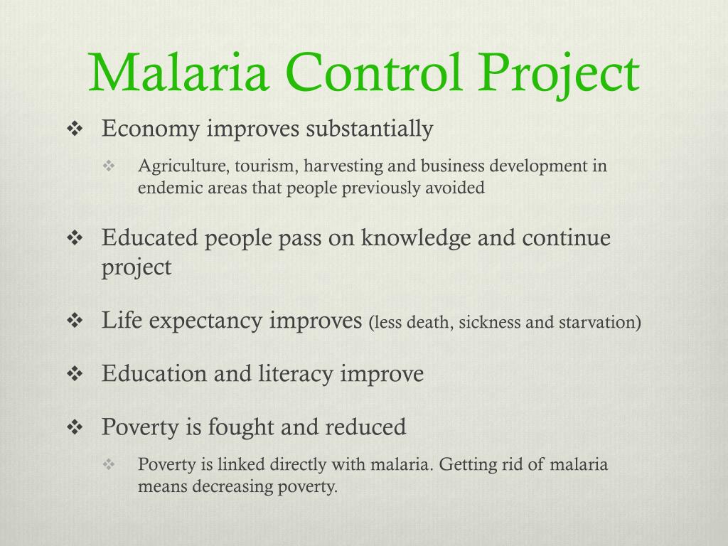 Malaria Control Project • Economy improves substantially • Agriculture, tourism, harvesting and business development in endemic areas that people previously avoided • Educated people pass on knowledge and continue project • Life expectancy improves (less death, sickness and starvation) • Education and literacy improve • Poverty is fought and reduced • Poverty is linked directly with malaria. Getting rid of malaria means decreasing poverty.
