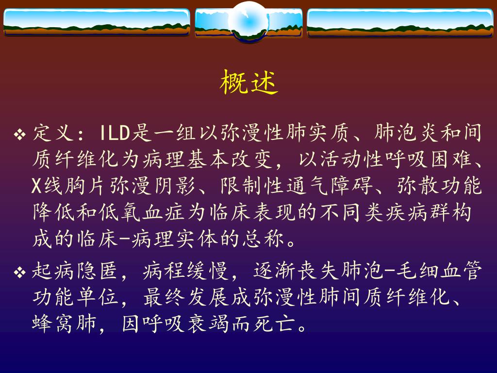 概述 • 定义:ILD是一组以弥漫性肺实质、肺泡炎和间质纤维化为病理基本改变,以活动性呼吸困难、X线胸片弥漫阴影、限制性通气障碍、弥散功能降低和低氧血症为临床表现的不同类疾病群构成的临床-病理实体的总称。 • 起病隐匿,病程缓慢,逐渐丧失肺泡-毛细血管功能单位,最终发展成弥漫性肺间质纤维化、蜂窝肺,因呼吸衰竭而死亡。