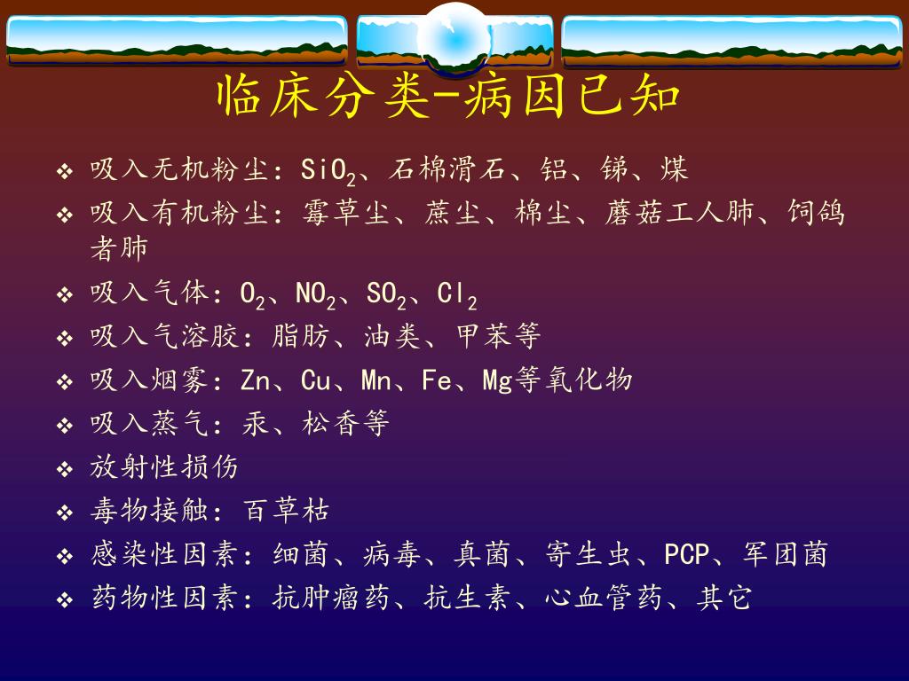 临床分类-病因已知 • 吸入无机粉尘:SiO2、石棉滑石、铝、锑、煤 • 吸入有机粉尘:霉草尘、蔗尘、棉尘、蘑菇工人肺、饲鸽者肺 • 吸入气体:O2、NO2、SO2、Cl2 • 吸入气溶胶:脂肪、油类、甲苯等 • 吸入烟雾:Zn、Cu、Mn、Fe、Mg等氧化物 • 吸入蒸气:汞、松香等 • 放射性损伤 • 毒物接触:百草枯 • 感染性因素:细菌、病毒、真菌、寄生虫、PCP、军团菌 • 药物性因素:抗肿瘤药、抗生素、心血管药、其它