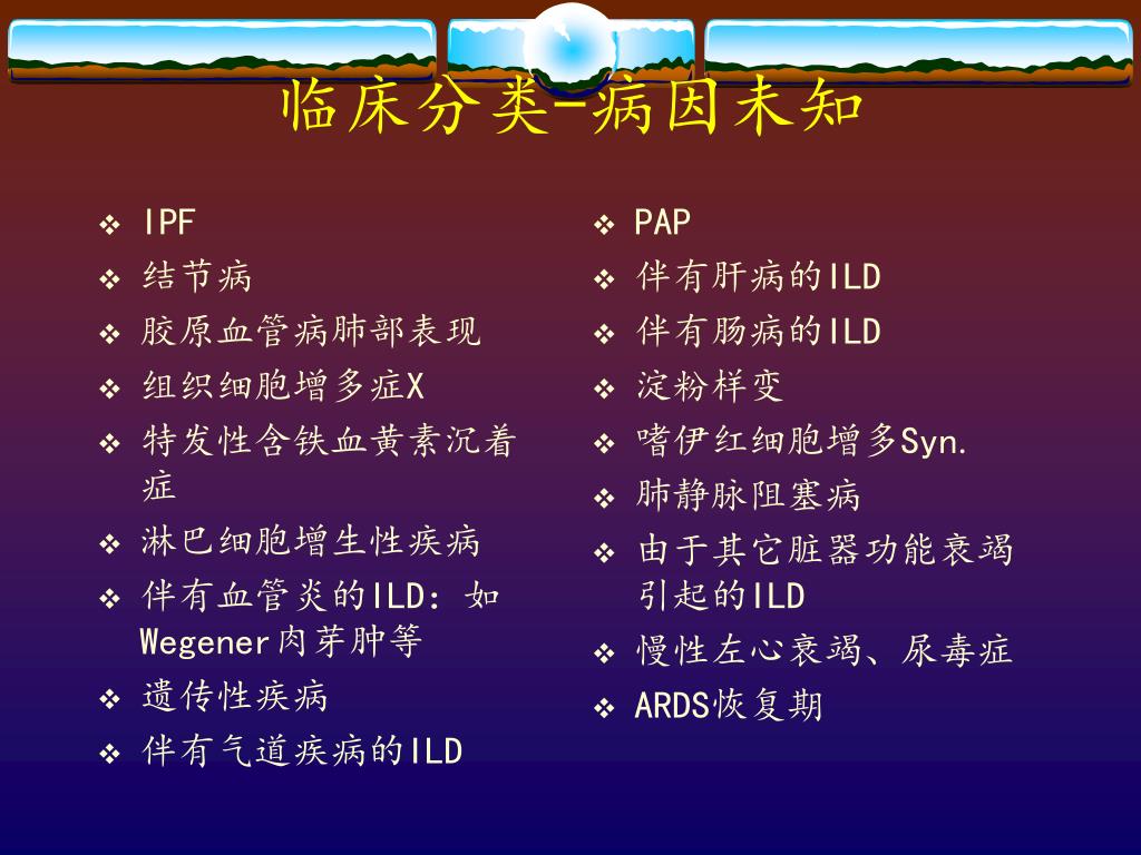 IPF 结节病 胶原血管病肺部表现 组织细胞增多症X 特发性含铁血黄素沉着症 淋巴细胞增生性疾病 伴有血管炎的ILD:如Wegener肉芽肿等 遗传性疾病 伴有气道疾病的ILD PAP 伴有肝病的ILD 伴有肠病的ILD 淀粉样变 嗜伊红细胞增多Syn. 肺静脉阻塞病 由于其它脏器功能衰竭引起的ILD 慢性左心衰竭、尿毒症 ARDS恢复期 临床分类-病因未知