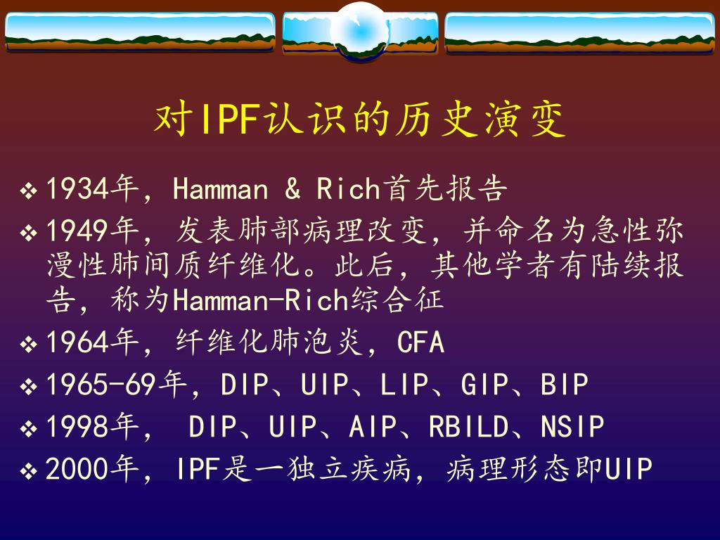 对IPF认识的历史演变 • 1934年,Hamman & Rich首先报告 • 1949年,发表肺部病理改变,并命名为急性弥漫性肺间质纤维化。此后,其他学者有陆续报告,称为Hamman-Rich综合征 • 1964年,纤维化肺泡炎,CFA • 1965-69年,DIP、UIP、LIP、GIP、BIP • 1998年, DIP、UIP、AIP、RBILD、NSIP • 2000年,IPF是一独立疾病,病理形态即UIP