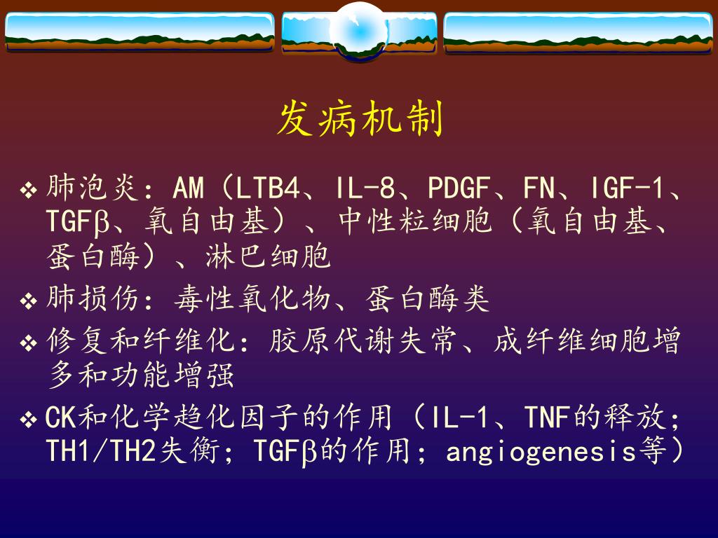 发病机制 • 肺泡炎:AM(LTB4、IL-8、PDGF、FN、IGF-1、TGF、氧自由基)、中性粒细胞(氧自由基、蛋白酶)、淋巴细胞 • 肺损伤:毒性氧化物、蛋白酶类 • 修复和纤维化:胶原代谢失常、成纤维细胞增多和功能增强 • CK和化学趋化因子的作用(IL-1、TNF的释放;TH1/TH2失衡;TGF的作用;angiogenesis等)