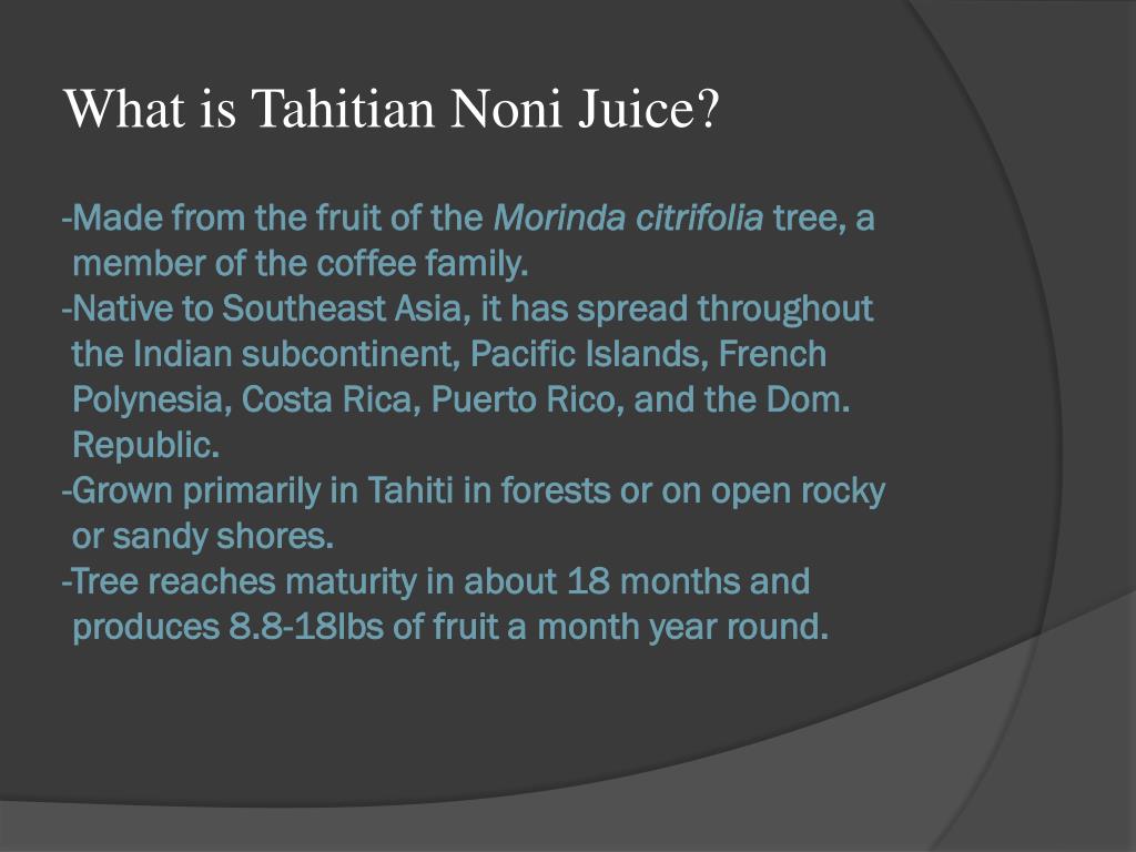 What is Tahitian Noni Juice? -Made from the fruit of the Morindacitrifoliatree, a member of the coffee family. -Native to Southeast Asia, it has spread throughout the Indian subcontinent, Pacific Islands, French Polynesia, Costa Rica, Puerto Rico, and the Dom. Republic.-Grown primarily in Tahiti in forests or on open rocky or sandy shores.-Tree reaches maturity in about 18 months and produces 8.8-18lbs of fruit a month year round.