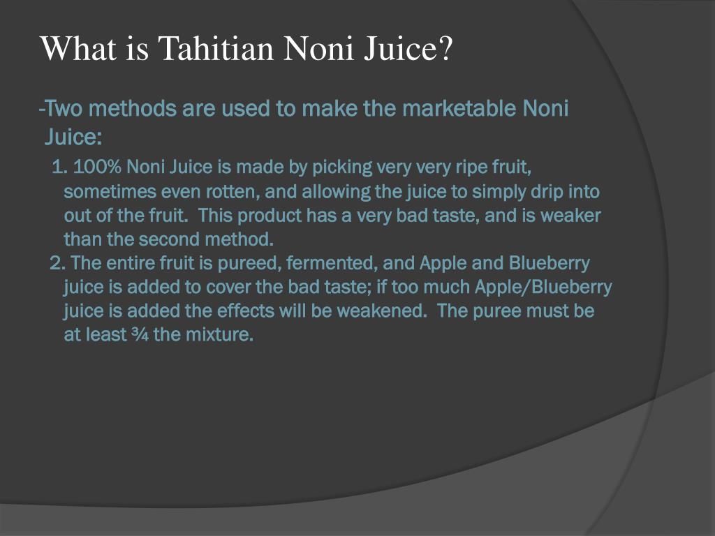 What is Tahitian Noni Juice? -Two methods are used to make the marketable Noni Juice:1. 100% Noni Juice is made by picking very very ripe fruit, sometimes even rotten, and allowing the juice to simply drip into out of the fruit. This product has a very bad taste, and is weaker than the second method. 2. The entire fruit is pureed, fermented, and Apple and Blueberry juice is added to cover the bad taste; if too much Apple/Blueberry juice is added the effects will be weakened. The puree must be at least ¾ the mixture.