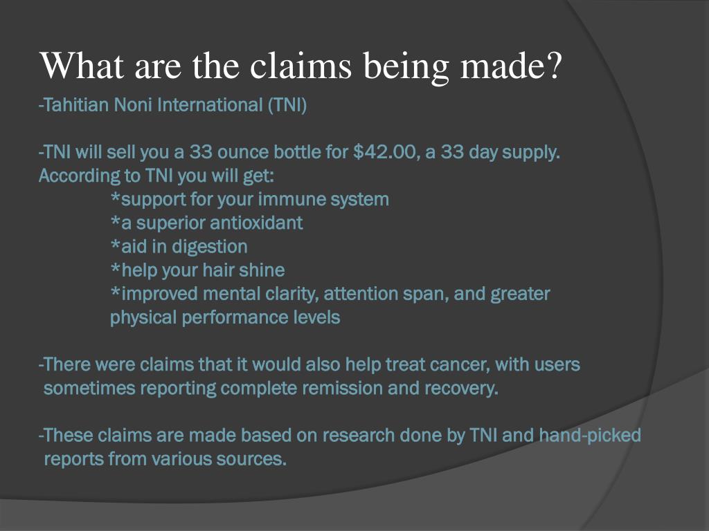 What are the claims being made? -Tahitian Noni International (TNI)-TNI will sell you a 33 ounce bottle for $42.00, a 33 day supply. According to TNI you will get: *support for your immune system *a superior antioxidant *aid in digestion *help your hair shine *improved mental clarity, attention span, and greater physical performance levels-There were claims that it would also help treat cancer, with users sometimes reporting complete remission and recovery.-These claims are made based on research done by TNI and hand-picked reports from various sources.