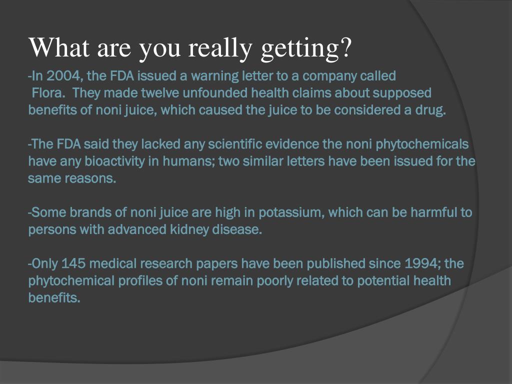 What are you really getting? -In 2004, the FDA issued a warning letter to a company called Flora. They made twelve unfounded health claims about supposed benefits of noni juice, which caused the juice to be considered a drug. -The FDA said they lacked any scientific evidence the noniphytochemicals have any bioactivity in humans; two similar letters have been issued for the same reasons.-Some brands of noni juice are high in potassium, which can be harmful to persons with advanced kidney disease. -Only 145 medical research papers have been published since 1994; the phytochemical profiles of noni remain poorly related to potential health benefits.