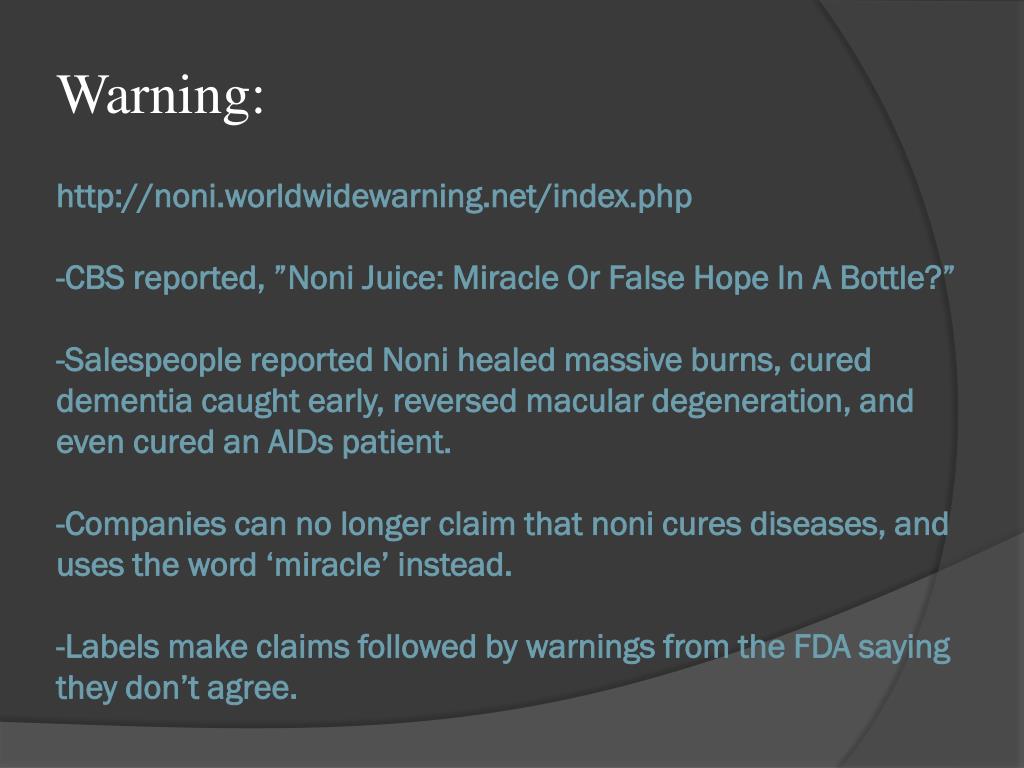 Warning: http://noni.worldwidewarning.net/index.php-CBS reported, ”NoniJuice: Miracle Or False Hope In A Bottle?”-Salespeople reported Noni healed massive burns, cured dementia caught early, reversed macular degeneration, and even cured an AIDs patient. -Companies can no longer claim that noni cures diseases, anduses the word ‘miracle’ instead. -Labels make claims followed by warnings from the FDA saying they don’t agree.