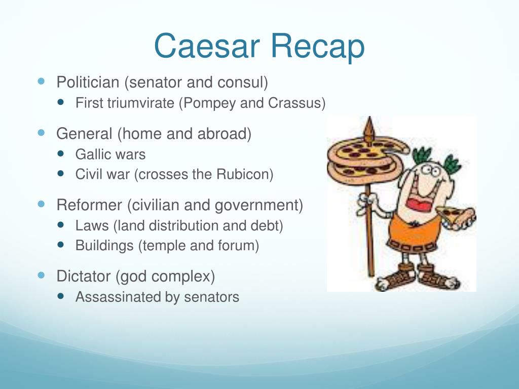 Caesar Recap • Politician (senator and consul) • First triumvirate (Pompey and Crassus) • General (home and abroad) • Gallic wars • Civil war (crosses the Rubicon) • Reformer (civilian and government) • Laws (land distribution and debt) • Buildings (temple and forum) • Dictator (god complex) • Assassinated by senators