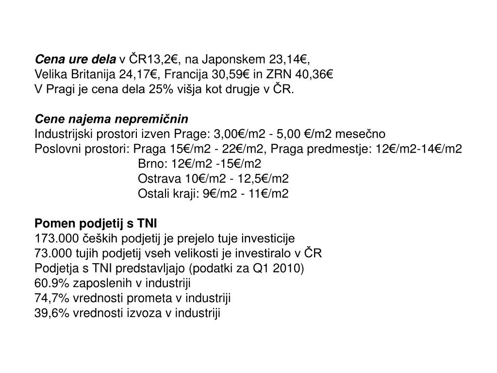 Cena ure dela v ČR13,2€, na Japonskem 23,14€, Velika Britanija 24,17€, Francija 30,59€ in ZRN 40,36€ V Pragi je cena dela 25% višja kot drugje v ČR. Cene najema nepremičnin Industrijski prostori izven Prage: 3,00€/m2 - 5,00 €/m2 mesečno Poslovni prostori: Praga 15€/m2 - 22€/m2, Praga predmestje: 12€/m2-14€/m2 Brno: 12€/m2 -15€/m2 Ostrava 10€/m2 - 12,5€/m2 Ostali kraji: 9€/m2 - 11€/m2 Pomen podjetij s TNI 173.000 čeških podjetij je prejelo tuje investicije 73.000 tujih podjetij vseh velikosti je investiralo v ČR Podjetja s TNI predstavljajo (podatki za Q1 2010) 60.9% zaposlenih v industriji 74,7% vrednosti prometa v industriji 39,6% vrednosti izvoza v industriji