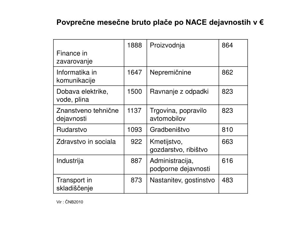 Povprečne mesečne bruto plače po NACE dejavnostih v € Vir : ČNB2010