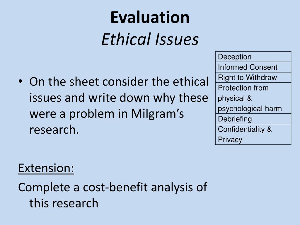 EvaluationEthical Issues On the sheet consider the ethical issues and write down why these were a problem in Milgram’s research. Extension: Complete a cost-benefit analysis of this research