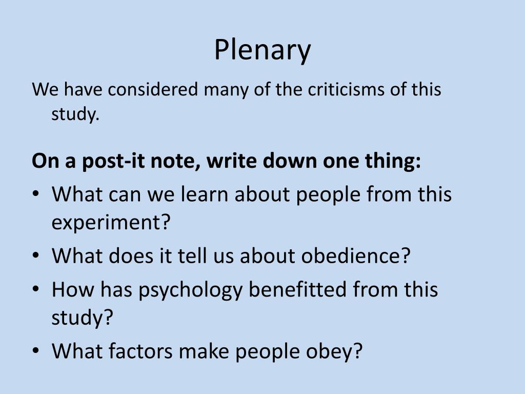 Plenary We have considered many of the criticisms of this study. On a post-it note, write down one thing: What can we learn about people from this experiment? What does it tell us about obedience? How has psychology benefitted from this study? What factors make people obey?