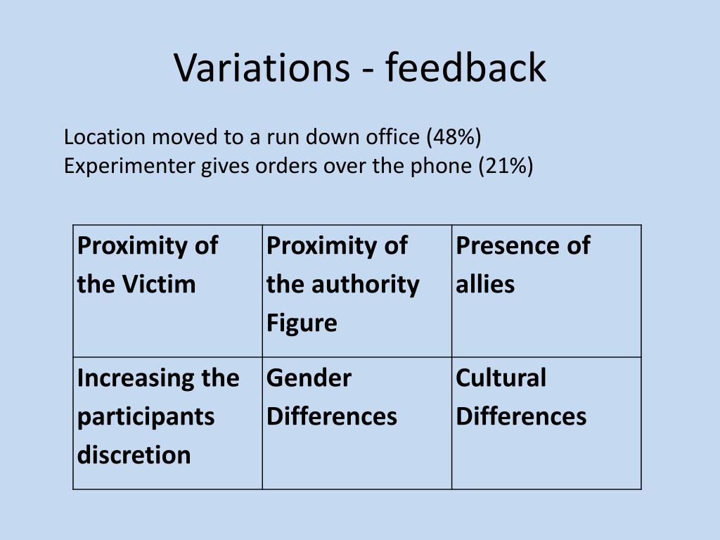 Variations - feedback Location moved to a run down office (48%) Experimenter gives orders over the phone (21%)
