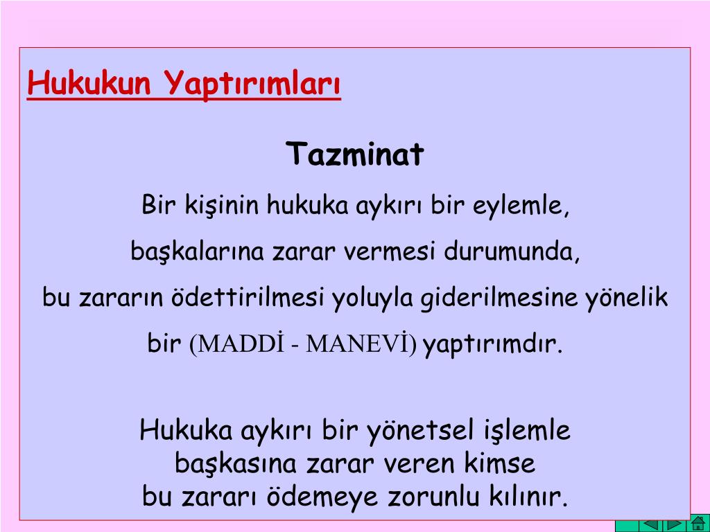 Hukukun Yaptırımları Tazminat Bir kişinin hukuka aykırı bir eylemle, başkalarına zarar vermesi durumunda, bu zararın ödettirilmesi yoluyla giderilmesine yönelik bir (MADDİ - MANEVİ) yaptırımdır. Hukuka aykırı bir yönetsel işlemle başkasına zarar veren kimse bu zararı ödemeye zorunlu kılınır.