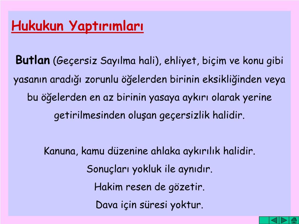 Hukukun Yaptırımları Hükümsüzlük / Geçerli Saymama Bir hukuksal işlemin, yasanın öngördüğü şekilde yapılmaması veya kanuna aykırı olarak yapılması halinde ortaya çıkan yaptırımdır. Hükümsüzlük, bazen yokluk bazen butlan (mutlak ve nispi butlan) bazen de tek taraflı bağlamazlık şeklinde ortaya çıkar.