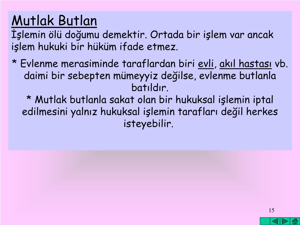 Mutlak Butlan • İşlemin ölü doğumu demektir. Ortada bir işlem var ancak işlem hukuki bir hüküm ifade etmez. • * Evlenme merasiminde taraflardan biri evli, akıl hastası vb. daimi bir sebepten mümeyyiz değilse, evlenme butlanla batıldır. • * Mutlak butlanla sakat olan bir hukuksal işlemin iptal edilmesini yalnız hukuksal işlemin tarafları değil herkes isteyebilir.