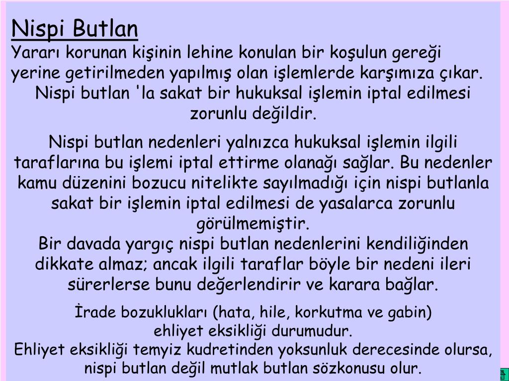 Nispi Butlan Yararı korunan kişinin lehine konulan bir koşulun gereği yerine getirilmeden yapılmış olan işlemlerde karşımıza çıkar. Nispi butlan 'la sakat bir hukuksal işlemin iptal edilmesi zorunlu değildir. Nispi butlan nedenleri yalnızca hukuksal işlemin ilgili taraflarına bu işlemi iptal ettirme olanağı sağlar. Bu nedenler kamu düzenini bozucu nitelikte sayılmadığı için nispi butlanla sakat bir işlemin iptal edilmesi de yasalarca zorunlu görülmemiştir. Bir davada yargıç nispi butlan nedenlerini kendiliğinden dikkate almaz; ancak ilgili taraflar böyle bir nedeni ileri sürerlerse bunu değerlendirir ve karara bağlar. İrade bozuklukları (hata, hile, korkutma ve gabin) ehliyet eksikliği durumudur. Ehliyet eksikliği temyiz kudretinden yoksunluk derecesinde olursa, nispi butlan değil mutlak butlan sözkonusu olur.