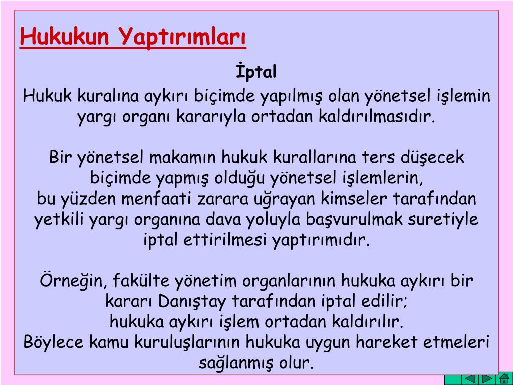 Hukukun Yaptırımları İptal Hukuk kuralına aykırı biçimde yapılmış olan yönetsel işlemin yargı organı kararıyla ortadan kaldırılmasıdır. Bir yönetsel makamın hukuk kurallarına ters düşecek biçimde yapmış olduğu yönetsel işlemlerin, bu yüzden menfaati zarara uğrayan kimseler tarafından yetkili yargı organına dava yoluyla başvurulmak suretiyle iptal ettirilmesi yaptırımıdır. Örneğin, fakülte yönetim organlarının hukuka aykırı bir kararı Danıştay tarafından iptal edilir; hukuka aykırı işlem ortadan kaldırılır. Böylece kamu kuruluşlarının hukuka uygun hareket etmeleri sağlanmış olur.