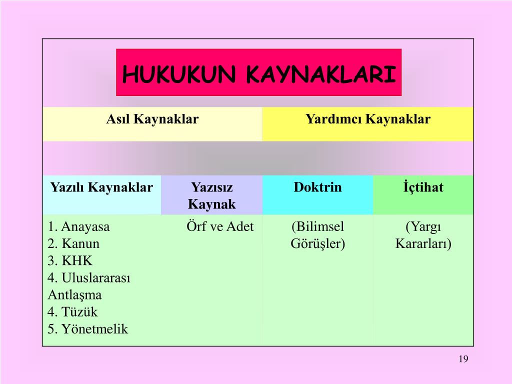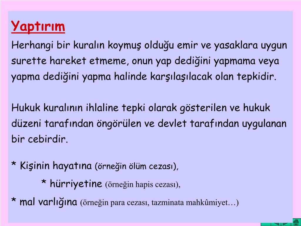 Yaptırım Herhangi bir kuralın koymuş olduğu emir ve yasaklara uygun surette hareket etmeme, onun yap dediğini yapmama veya yapma dediğini yapma halinde karşılaşılacak olan tepkidir. Hukuk kuralının ihlaline tepki olarak gösterilen ve hukuk düzeni tarafından öngörülen ve devlet tarafından uygulanan bir cebirdir. * Kişinin hayatına (örneğin ölüm cezası), * hürriyetine (örneğin hapis cezası), * mal varlığına (örneğin para cezası, tazminata mahkûmiyet…)