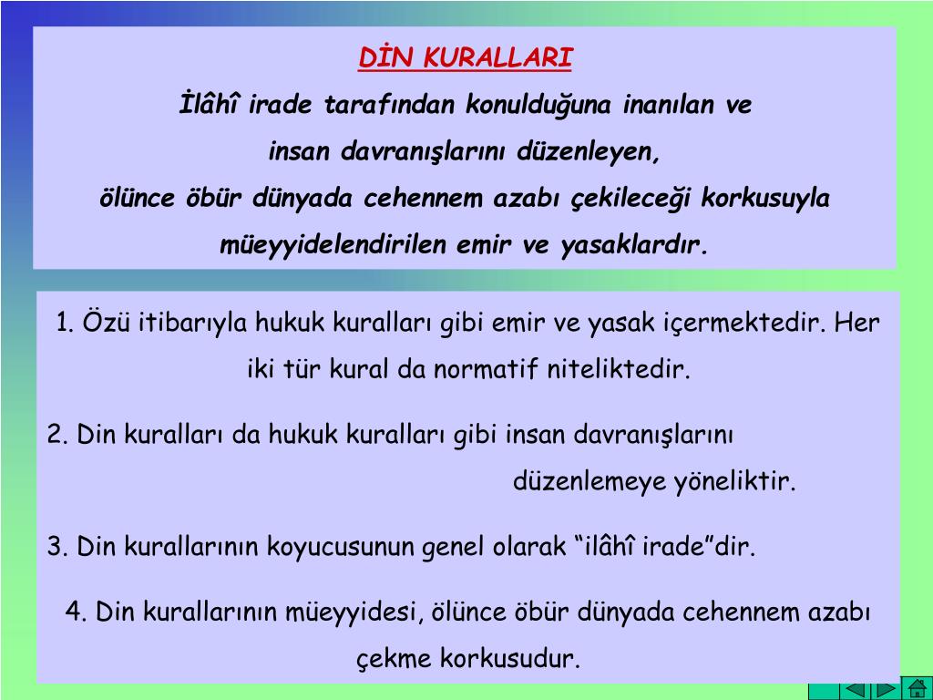 DİN KURALLARI İlâhî irade tarafından konulduğuna inanılan ve insan davranışlarını düzenleyen, ölünce öbür dünyada cehennem azabı çekileceği korkusuyla müeyyidelendirilen emir ve yasaklardır. 1. Özü itibarıyla hukuk kuralları gibi emir ve yasak içermektedir. Her iki tür kural da normatif niteliktedir. 2. Din kuralları da hukuk kuralları gibi insan davranışlarını düzenlemeye yöneliktir. 3. Din kurallarının koyucusunun genel olarak “ilâhî irade”dir. 4. Din kurallarının müeyyidesi, ölünce öbür dünyada cehennem azabı çekme korkusudur.