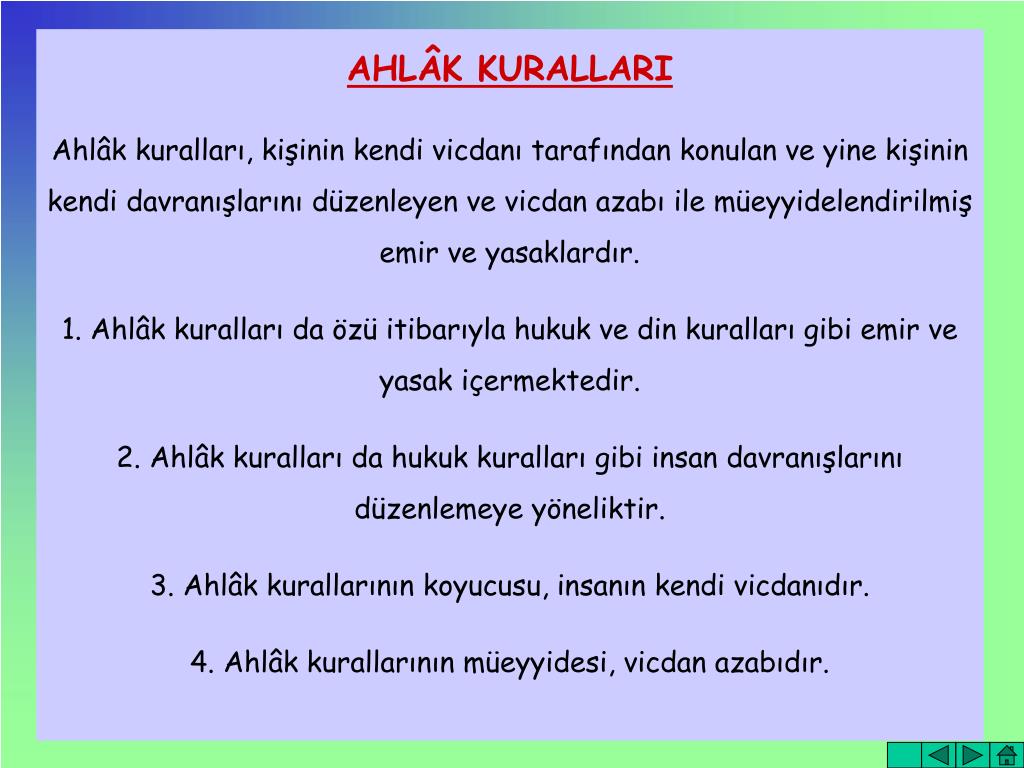 AHLÂK KURALLARI Ahlâk kuralları, kişinin kendi vicdanı tarafından konulan ve yine kişinin kendi davranışlarını düzenleyen ve vicdan azabı ile müeyyidelendirilmiş emir ve yasaklardır. 1. Ahlâk kuralları da özü itibarıyla hukuk ve din kuralları gibi emir ve yasak içermektedir. 2. Ahlâk kuralları da hukuk kuralları gibi insan davranışlarını düzenlemeye yöneliktir. 3. Ahlâk kurallarının koyucusu, insanın kendi vicdanıdır. 4. Ahlâk kurallarının müeyyidesi, vicdan azabıdır.