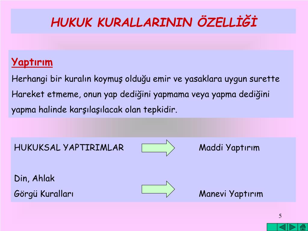 HUKUK KURALLARININ ÖZELLİĞİ Yaptırım Herhangi bir kuralın koymuş olduğu emir ve yasaklara uygun surette Hareket etmeme, onun yap dediğini yapmama veya yapma dediğini yapma halinde karşılaşılacak olan tepkidir. HUKUKSAL YAPTIRIMLAR Maddi Yaptırım Din, Ahlak Görgü Kuralları Manevi Yaptırım