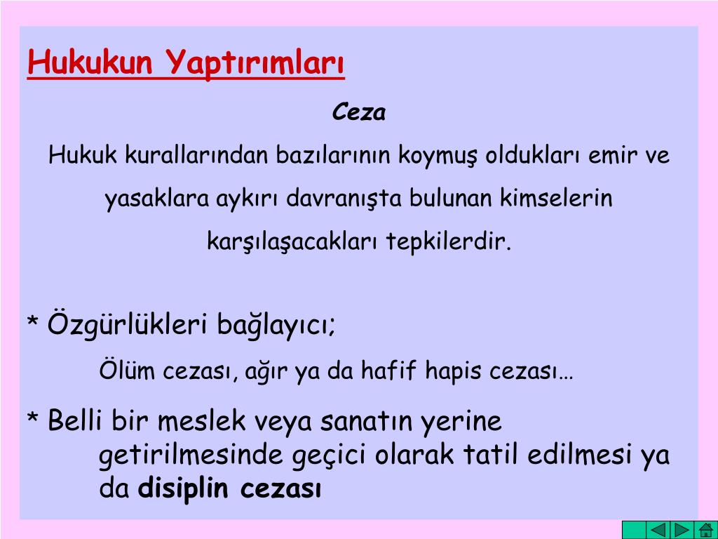 Hukukun Yaptırımları Ceza Hukuk kurallarından bazılarının koymuş oldukları emir ve yasaklara aykırı davranışta bulunan kimselerin karşılaşacakları tepkilerdir. * Özgürlükleri bağlayıcı; Ölüm cezası, ağır ya da hafif hapis cezası… * Belli bir meslek veya sanatın yerine getirilmesinde geçici olarak tatil edilmesi ya da disiplin cezası