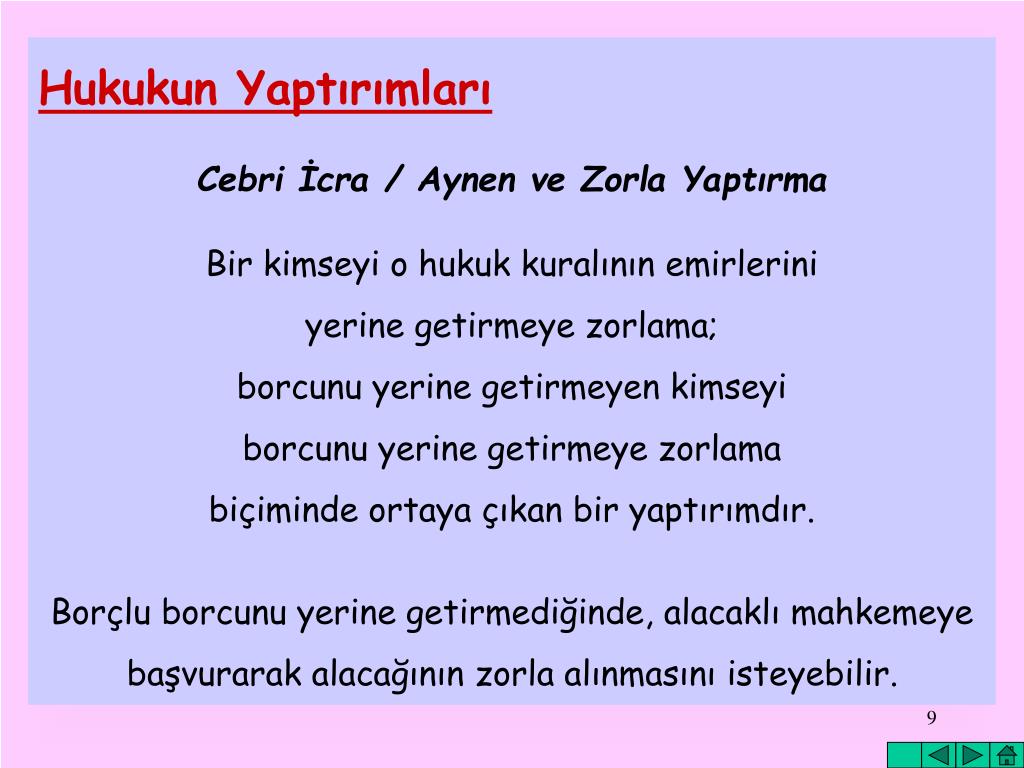 Hukukun Yaptırımları Cebri İcra / Aynen ve Zorla Yaptırma Bir kimseyi o hukuk kuralının emirlerini yerine getirmeye zorlama; borcunu yerine getirmeyen kimseyi borcunu yerine getirmeye zorlama biçiminde ortaya çıkan bir yaptırımdır. Borçlu borcunu yerine getirmediğinde, alacaklı mahkemeye başvurarak alacağının zorla alınmasını isteyebilir.