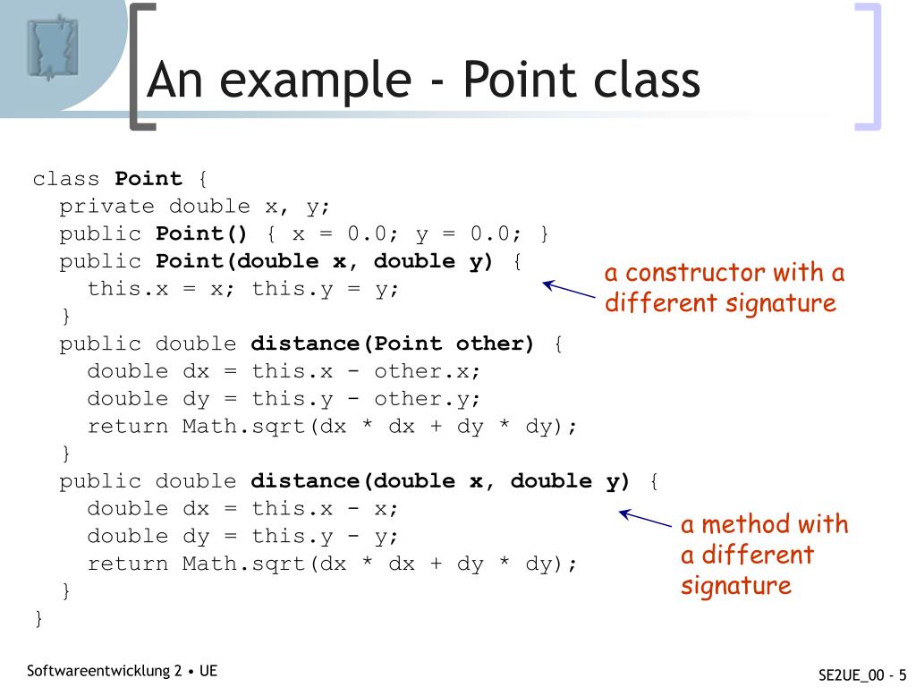 a constructor with a different signature a method with a different signature An example - Point class class Point { private double x, y; public Point() { x = 0.0; y = 0.0; } public Point(double x, double y) { this.x = x; this.y = y; } public double distance(Point other) { double dx = this.x - other.x; double dy = this.y - other.y; return Math.sqrt(dx * dx + dy * dy); } public double distance(double x, double y) { double dx = this.x - x; double dy = this.y - y; return Math.sqrt(dx * dx + dy * dy); } } SE2UE_00 - 5