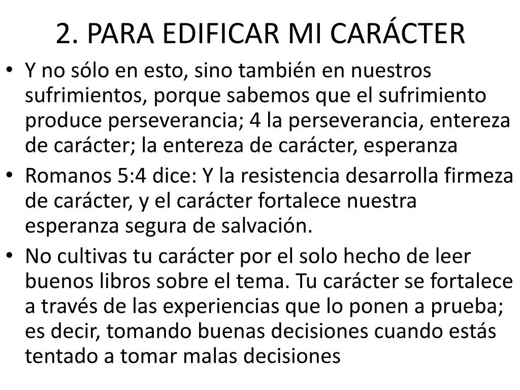 2. PARA EDIFICAR MI CARÁCTER • Y no sólo en esto, sino también en nuestros sufrimientos, porque sabemos que el sufrimiento produce perseverancia; 4 la perseverancia, entereza de carácter; la entereza de carácter, esperanza • Romanos 5:4 dice: Y la resistencia desarrolla firmeza de carácter, y el carácter fortalece nuestra esperanza segura de salvación. • No cultivas tu carácter por el solo hecho de leer buenos libros sobre el tema. Tu carácter se fortalece a través de las experiencias que lo ponen a prueba; es decir, tomando buenas decisiones cuando estás tentado a tomar malas decisiones