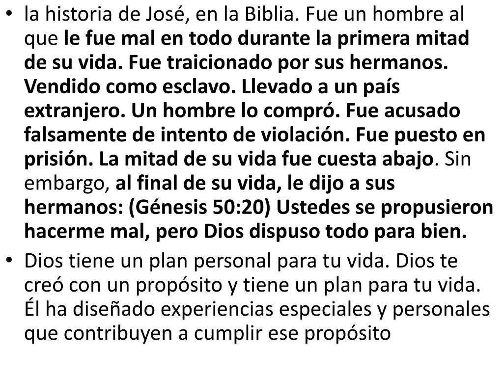 la historia de José, en la Biblia. Fue un hombre al que le fue mal en todo durante la primera mitad de su vida. Fue traicionado por sus hermanos. Vendido como esclavo. Llevado a un país extranjero. Un hombre lo compró. Fue acusado falsamente de intento de violación. Fue puesto en prisión. La mitad de su vida fue cuesta abajo. Sin embargo, al final de su vida, le dijo a sus hermanos: (Génesis 50:20) Ustedes se propusieron hacerme mal, pero Dios dispuso todo para bien. • Dios tiene un plan personal para tu vida. Dios te creó con un propósito y tiene un plan para tu vida. Él ha diseñado experiencias especiales y personales que contribuyen a cumplir ese propósito