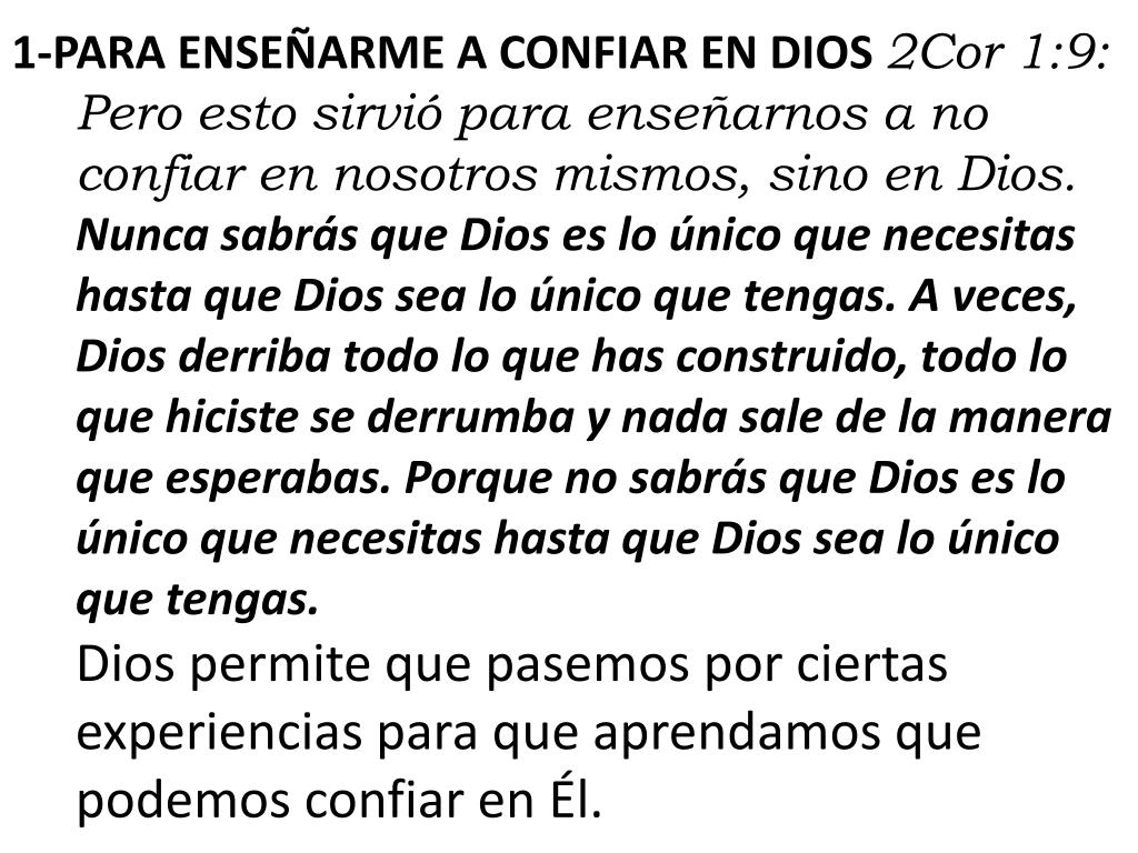 1-PARA ENSEÑARME A CONFIAR EN DIOS 2Cor 1:9: Pero esto sirvió para enseñarnos a no confiar en nosotros mismos, sino en Dios. Nunca sabrás que Dios es lo único que necesitas hasta que Dios sea lo único que tengas. A veces, Dios derriba todo lo que has construido, todo lo que hiciste se derrumba y nada sale de la manera que esperabas. Porque no sabrás que Dios es lo único que necesitas hasta que Dios sea lo único que tengas.Dios permite que pasemos por ciertas experiencias para que aprendamos quepodemos confiar en Él.