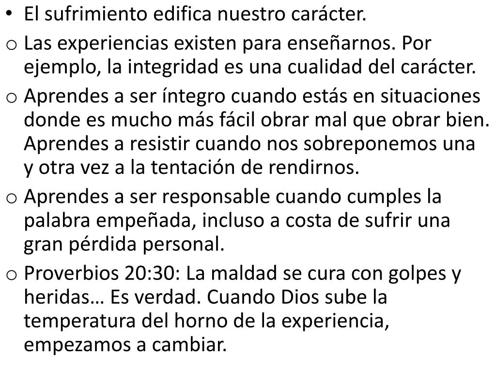 El sufrimiento edifica nuestro carácter. • Las experiencias existen para enseñarnos. Por ejemplo, la integridad es una cualidad del carácter. • Aprendes a ser íntegro cuando estás en situaciones donde es mucho más fácil obrar mal que obrar bien. Aprendes a resistir cuando nos sobreponemos una y otra vez a la tentación de rendirnos. • Aprendes a ser responsable cuando cumples la palabra empeñada, incluso a costa de sufrir una gran pérdida personal. • Proverbios 20:30: La maldad se cura con golpes y heridas… Es verdad. Cuando Dios sube la temperatura del horno de la experiencia, empezamos a cambiar.