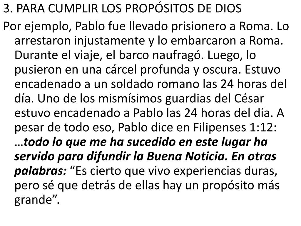 3. PARA CUMPLIR LOS PROPÓSITOS DE DIOS Por ejemplo, Pablo fue llevado prisionero a Roma. Lo arrestaron injustamente y lo embarcaron a Roma. Durante el viaje, el barco naufragó. Luego, lo pusieron en una cárcel profunda y oscura. Estuvo encadenado a un soldado romano las 24 horas del día. Uno de los mismísimos guardias del César estuvo encadenado a Pablo las 24 horas del día. A pesar de todo eso, Pablo dice en Filipenses 1:12: …todo lo que me ha sucedido en este lugar ha servido para difundir la Buena Noticia. En otras palabras: “Es cierto que vivo experiencias duras, pero sé que detrás de ellas hay un propósito más grande”.