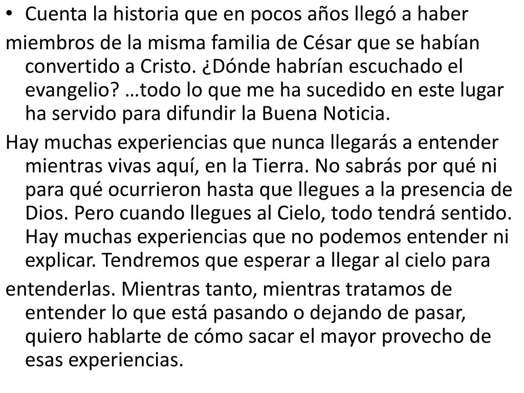 Cuenta la historia que en pocos años llegó a haber miembros de la misma familia de César que se habían convertido a Cristo. ¿Dónde habrían escuchado el evangelio? …todo lo que me ha sucedido en este lugar ha servido para difundir la Buena Noticia. Hay muchas experiencias que nunca llegarás a entender mientras vivas aquí, en la Tierra. No sabrás por qué ni para qué ocurrieron hasta que llegues a la presencia de Dios. Pero cuando llegues al Cielo, todo tendrá sentido. Hay muchas experiencias que no podemos entender ni explicar. Tendremos que esperar a llegar al cielo para entenderlas. Mientras tanto, mientras tratamos de entender lo que está pasando o dejando de pasar, quiero hablarte de cómo sacar el mayor provecho de esas experiencias.