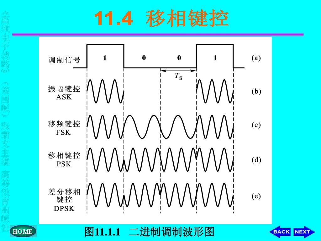 《高频电子线路》(第四版)张肃文主编 高等教育出版社 11.4 移相键控 11.4.1 二相移相键控 11.4.2 四相移相键控 11.4.3 移相键控与移频键控的简单比较