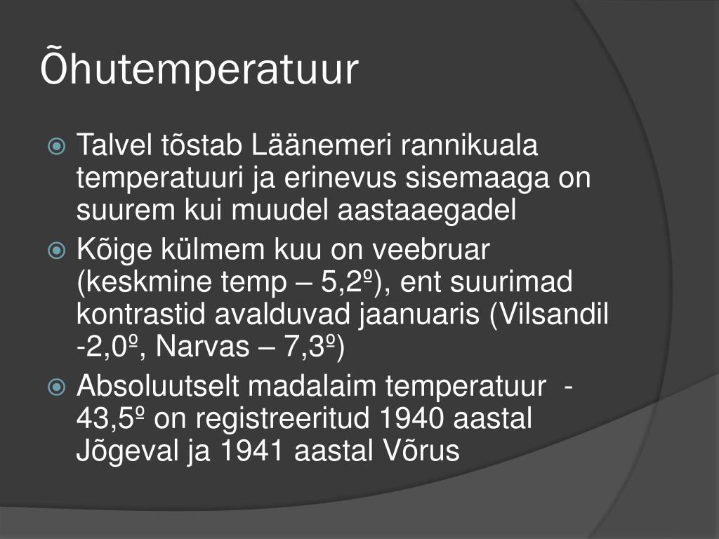 Õhutemperatuur • Talvel tõstab Läänemeri rannikuala temperatuuri ja erinevus sisemaaga on suurem kui muudel aastaaegadel • Kõige külmem kuu on veebruar (keskmine temp – 5,2º), ent suurimad kontrastid avalduvad jaanuaris (Vilsandil -2,0º, Narvas – 7,3º) • Absoluutselt madalaim temperatuur -43,5º on registreeritud 1940 aastal Jõgeval ja 1941 aastal Võrus