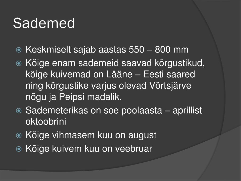 Sademed • Keskmiselt sajab aastas 550 – 800 mm • Kõige enam sademeid saavad kõrgustikud, kõige kuivemad on Lääne – Eesti saared ning kõrgustike varjus olevad Võrtsjärve nõgu ja Peipsi madalik. • Sademeterikas on soe poolaasta – aprillist oktoobrini • Kõige vihmasem kuu on august • Kõige kuivem kuu on veebruar