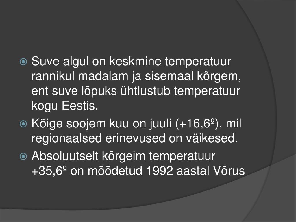 Suve algul on keskmine temperatuur rannikul madalam ja sisemaal kõrgem, ent suve lõpuks ühtlustub temperatuur kogu Eestis. • Kõige soojem kuu on juuli (+16,6º), mil regionaalsed erinevused on väikesed. • Absoluutselt kõrgeim temperatuur +35,6º on mõõdetud 1992 aastal Võrus