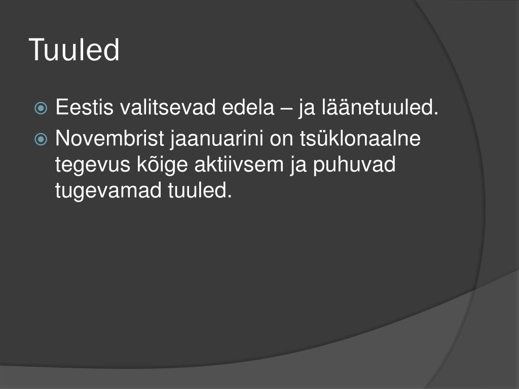 Tuuled • Eestis valitsevad edela – ja läänetuuled. • Novembrist jaanuarini on tsüklonaalne tegevus kõige aktiivsem ja puhuvad tugevamad tuuled.