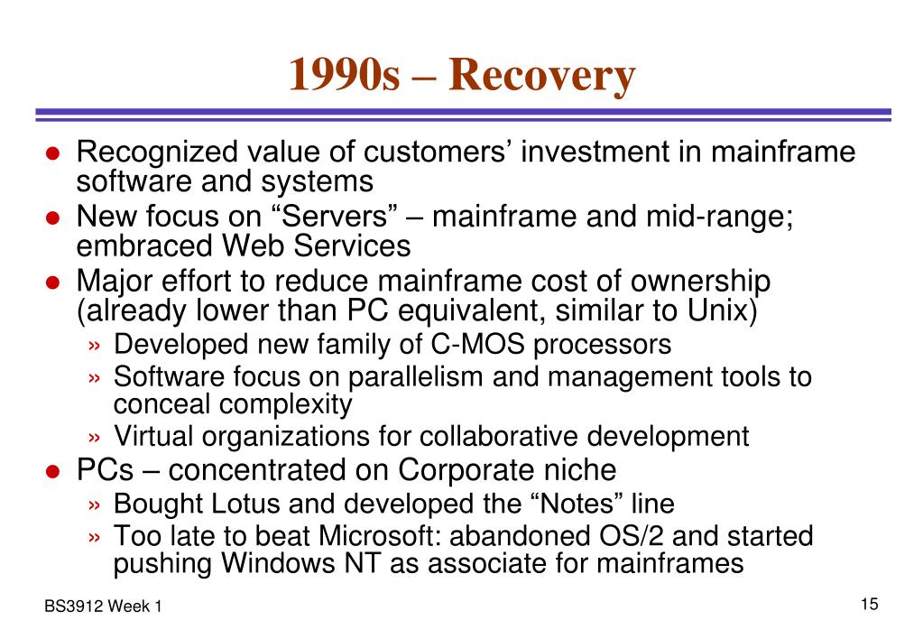 1990s – Recovery • Recognized value of customers’ investment in mainframe software and systems • New focus on “Servers” – mainframe and mid-range; embraced Web Services • Major effort to reduce mainframe cost of ownership(already lower than PC equivalent, similar to Unix) • Developed new family of C-MOS processors • Software focus on parallelism and management tools to conceal complexity • Virtual organizations for collaborative development • PCs – concentrated on Corporate niche • Bought Lotus and developed the “Notes” line • Too late to beat Microsoft: abandoned OS/2 and started pushing Windows NT as associate for mainframes