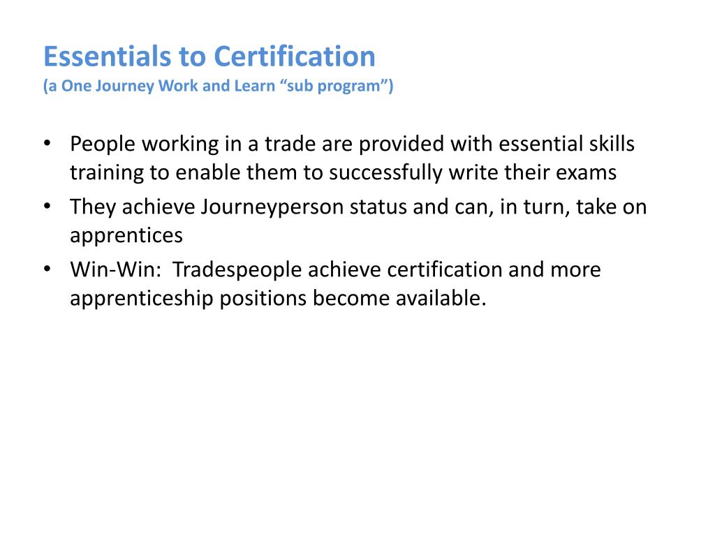Essentials to Certification(a One Journey Work and Learn “sub program”) • People working in a trade are provided with essential skills training to enable them to successfully write their exams • They achieve Journeyperson status and can, in turn, take on apprentices • Win-Win: Tradespeople achieve certification and more apprenticeship positions become available.