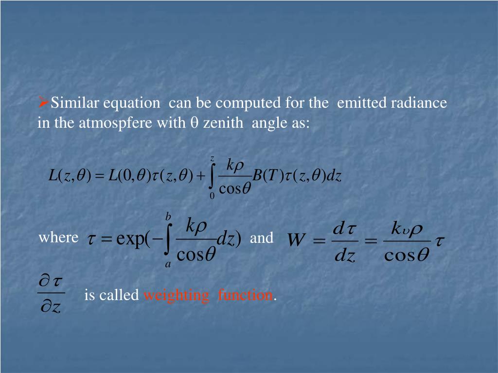 where and • Similar equation can be computed for the emitted radiance in the atmospfere with zenith angle as: is called weighting function.