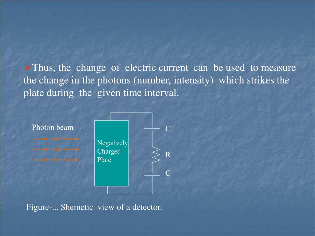 Thus, the change of electric current can be used to measure the change in the photons (number, intensity) which strikes the plate during the given time interval. Photon beam C Negatively Charged Plate R C Figure-... Shemetic view of a detector.